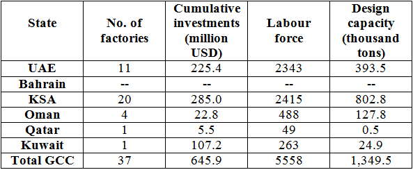 In this regard, GOIC 's IMI Plus data reveal that KSA was ranked first in this area in 2013. It has 20 factories with cumulative investments of 285 million USD, 44.1% of the total GCC investments in this industry. This sector in Saudi Arabia employed 2415 workers (43.5% of the total workers in GCC countries) and achieved 59.5% of the total GCC design capacity. The UAE was ranked second with 11 factories and cumulative investments worth 225.4 million USD (39%), a labour force of 2343 workers (42.2%) and 29.1% of the total GCC oils and fats design capacity.