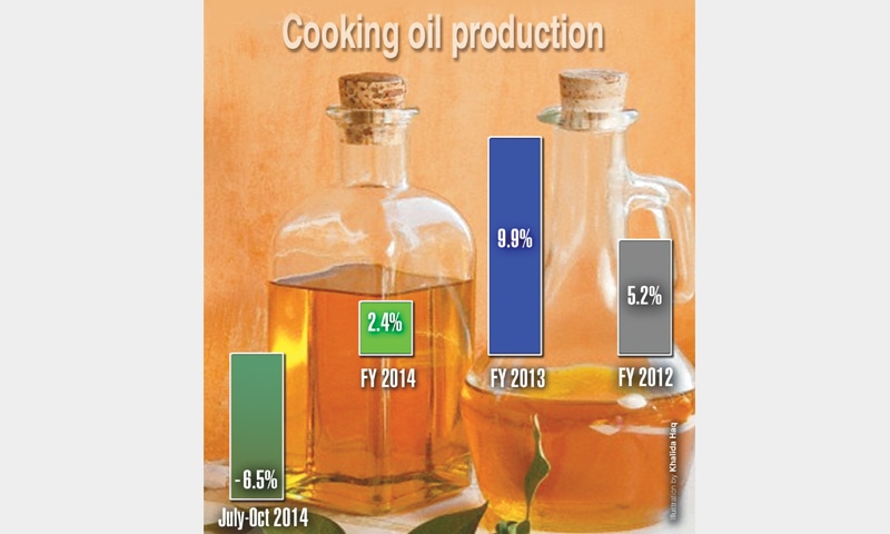 In FY14, production of cooking oil grew around 2.4pc and in four months of this fiscal year it fell by 6.5pc. This is in a sharp contrast to a handsome 9.9pc growth in FY13, and 5.2pc in FY12.