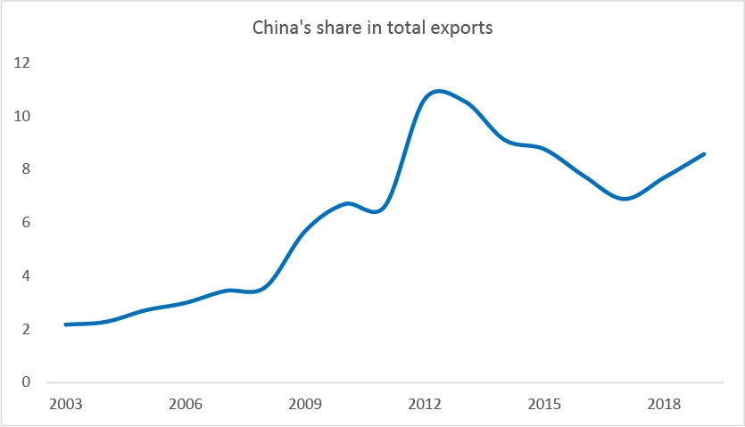 Data from ITC’s Trademap.org shows exports to China rose from a meagre two percent in 2003 to 5.7 percent in 2009. It continued to increase, peaking at 10.6 percent in 2012. Based on the limited capabilities of exporters, the FTA with China did witness a rise in the value of exports and the share of exports to China. It is successful in this regard. It then reported a slight downturn, reducing to seven percent in 2017. The share has recovered since then and was reported at 8.6 percent in 2019.