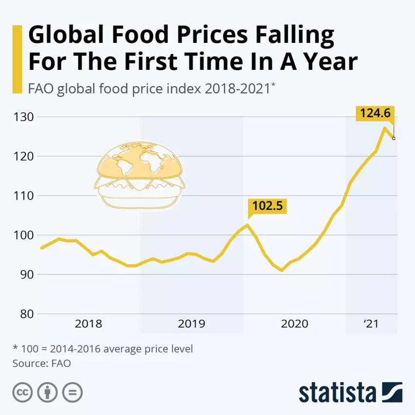- Average global food prices are now decreasing, even though they're still 25% more expensive than the 2014 - 2016 average.
