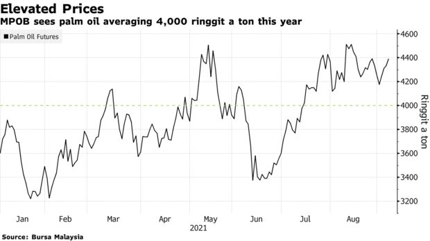 Palm oil is expected to remain elevated through the rest of 2021 to average about 4,000 ringgit a ton, according to Malaysian Palm Oil Board’s director-general Ahmad Parveez Ghulam Kadir. So far this year, prices have averaged 3,876 ringgit.Toward year-end, a pick up in production is expected to boost stockpiles. This may lead to a correction in prices, he said at a conference Tuesday.