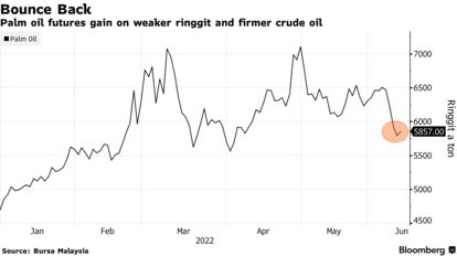 14.06.2022 (www.bloomberg.com) - Palm oil ended higher as a weaker Malaysian currency made the tropical oil cheaper for overseas buyers, while higher petroleum prices raised its biofuel appeal.