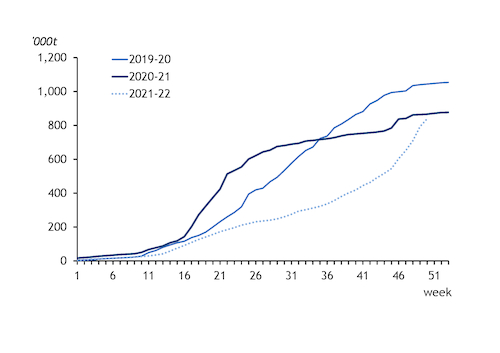 Greater SFS imports in recent weeks have allowed cumulative imports for this marketing year to catch up to 2020-21's import pace. Cumulative imports stood at 839,000t as of the 50th week in 2021-22 ending 12 June, down by just 3pc on the year — three months earlier, cumulative imports amounted to just half of the volume compared with the same point in 2020-21.